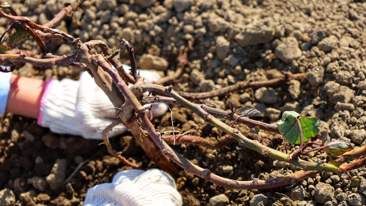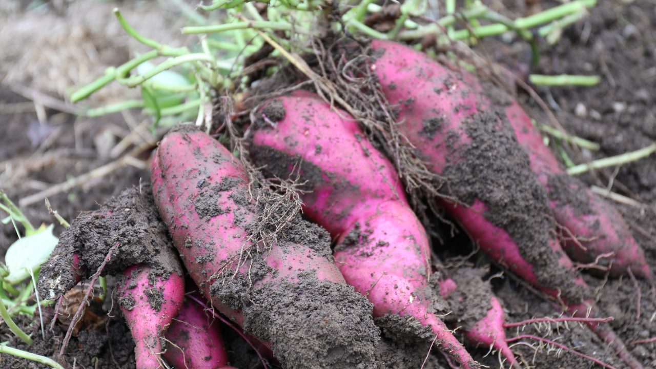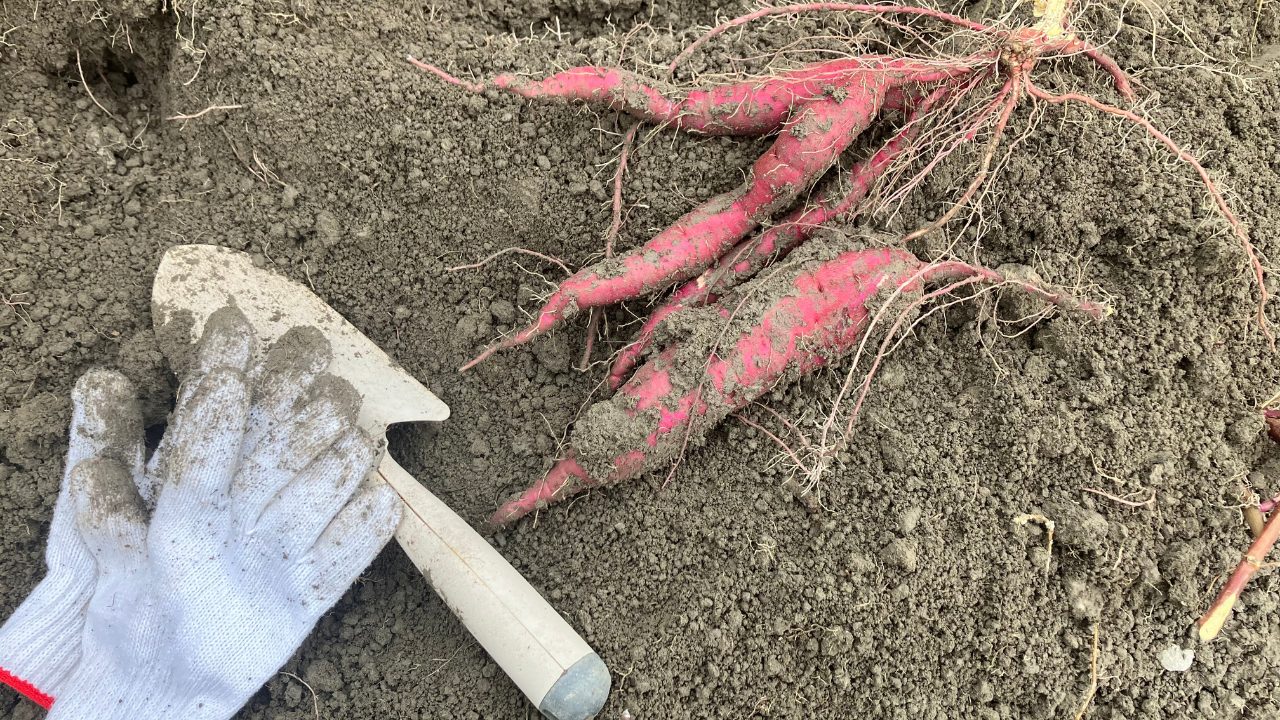 サツマイモは皮がデリケート。まずツルを頼りに株元を確認し、外周から手や園芸フォークで土をほぐしていきます。刃先は浅く入れ、芋に当たる感触がしたら手で慎重にかき出すと傷防止につながります。