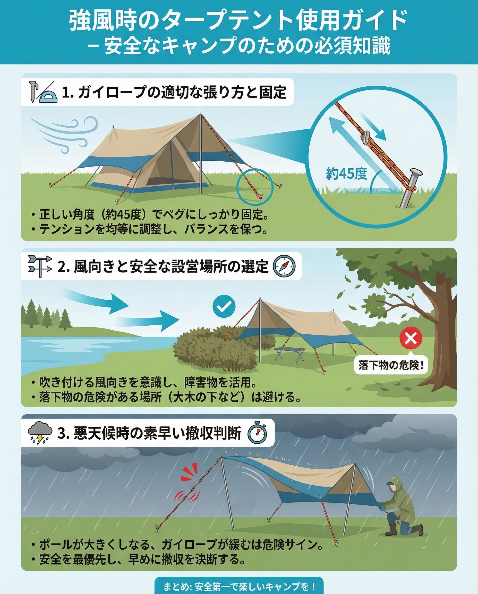 ガイロープやポールが頻繁に大きく動き始めたら危険です。タープや周囲の状況を観察し、安全を確保するために早めに判断してください。