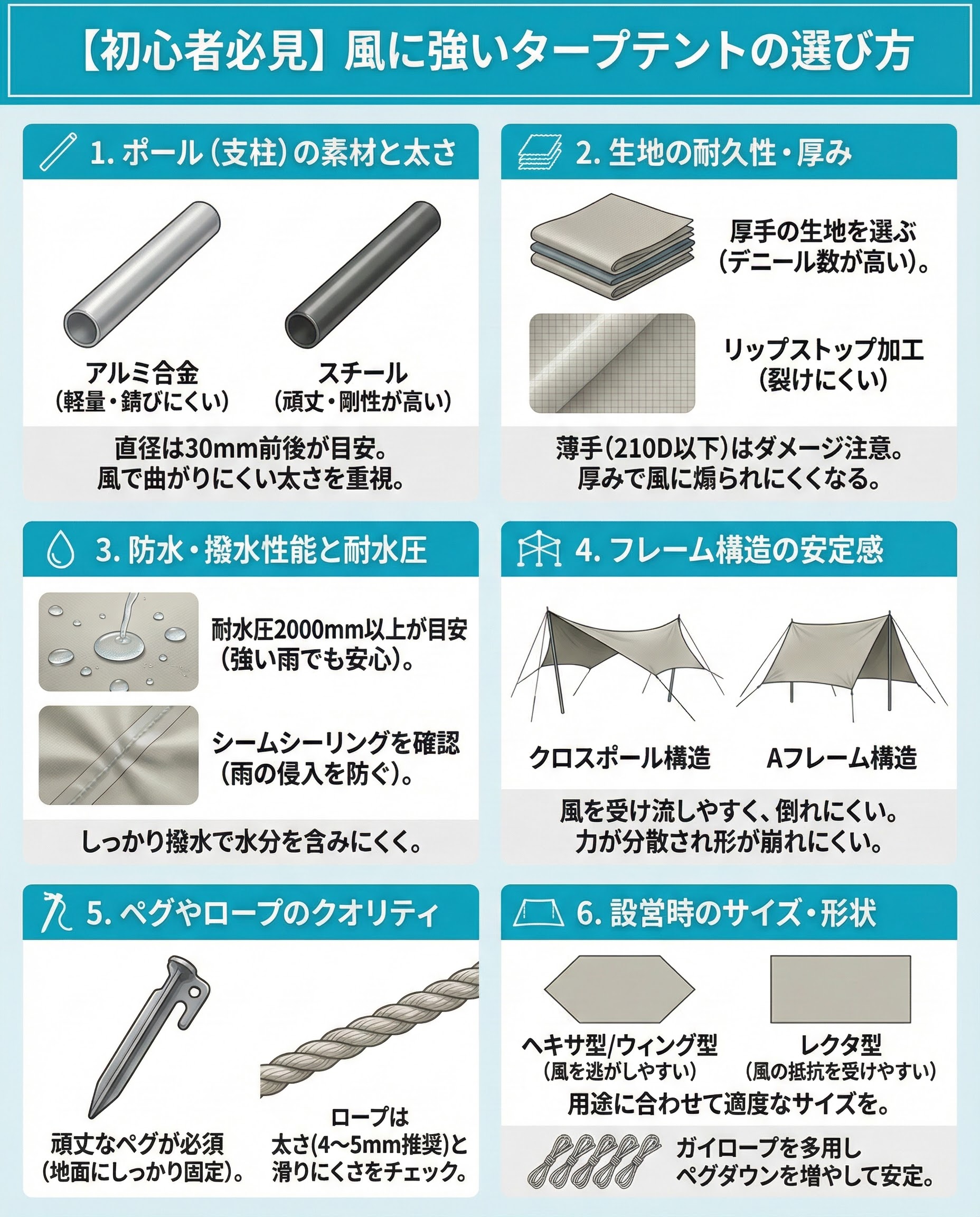 ポールが風によってたわむとタープの安定感が損なわれやすいです。素材は軽量で錆びにくいアルミ合金や、頑丈で剛性が高いスチールなどを選ぶと安心できます。太さは適切な直径を確保し、風の強い日でも曲がりにくいものを重視しましょう。